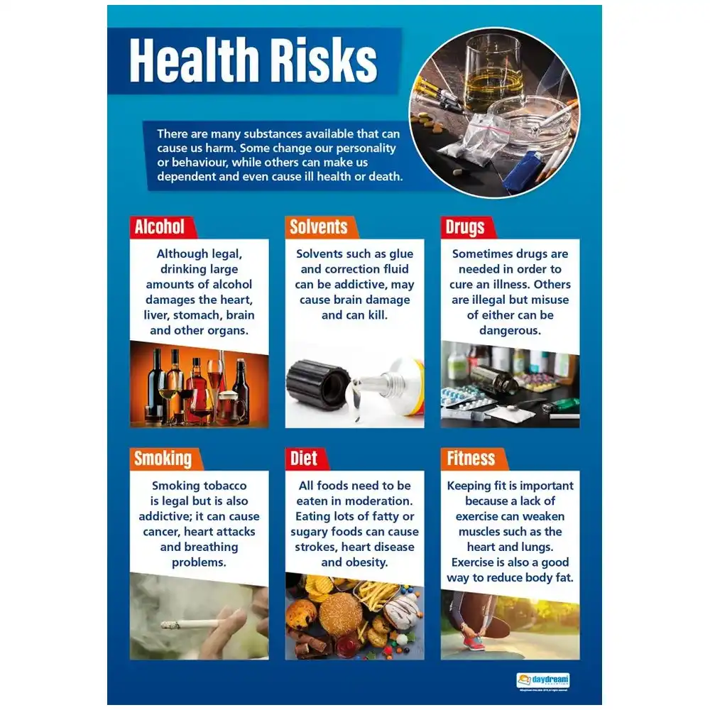 The Health Risks Wall Chart is ideal for classroom walls and school hallways. The large A1 size (840mm x 594mm) makes the bright and informative chart highly readable from a distance, complementing every learning environment.