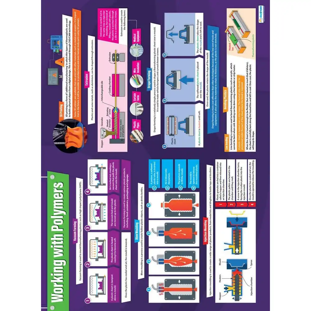 The poster’s accessible information explains in clear English every part of this fundamental Design and Technology topic. Alongside each value-rich textbox is a bright, full-colour image which makes the tough topic of working with polymers fun and simple to learn. The poster’s large A1 layout is optimised for visual learners with its stimulating design and vivid colours, making it an essential addition to any Design and Technology class.