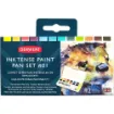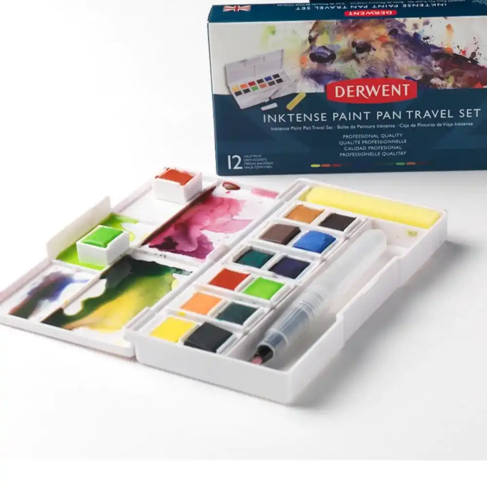 12 Inktense paint pans in a traditional colour palette, 1 mini waterbrush, 5 mixing palettes and 1 spongeHalf size pans, ideal for travelAdvanced performance with specially formulated active colour technologyRichly coloured pigments intensify when activated with waterLight washes dry permanentlyUse on porous materials for a wide range of fine art and craft projectsFixed in place on fabrics when hand washed in cool water (below 30 degrees) with no harsh detergentsFor best results, pair with: Derwent Inktense Paper, Specialist Artist Erasers, Push Button Waterbrushes, Spritzer and ArtpackColour Palette: Sun Yellow, Mango, Poppy Red, Dark Plum, Mid Ultramarine, Bright Blue, Teal Green, Racing Green, Kiwi, Burnt Yellow Ochre, Natural Brown and Ink Black