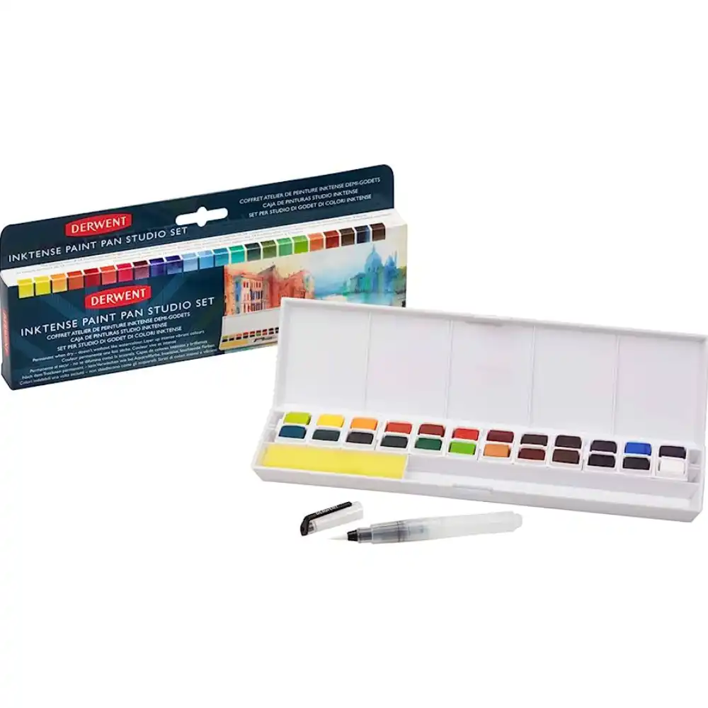 Contains 24 Inktense paint pans, a mini water brush, a sponge and five mixing palettes.Colour Palette - Sherbet Lemon, Sun Yellow, Mango, Bright Orange, Poppy Red, Cherry, Fuchsia, Fuchsia, Fuchsia, Dark Plum, Violet, Navy Blue, Mid Ultramarine, Bright Blue, Turquoise, Racing Green, Ionian Green, Teal Green, Hookers Green, Kiwi, Burnt Yellow Ochre, Red Oxide, Natural Brown, Payne's Grey, Ink Black, Antique White