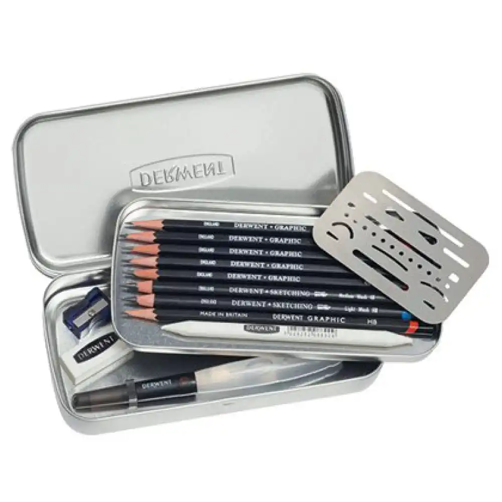 The set comes with 5 Derwent Graphic Pencils, high-quality sketching instruments with easy-grip hexagonal barrels in a variety of hardness. It includes 2 Derwent Watersoluble Sketching Pencils, with soft wide cores that make bold lines when dry and soft, subtle washes when wet. Along with these comes a range of handy accessories including a Derwent Waterbrush which carries water in its barrel, the whole lot housed in a handsome silver tin.