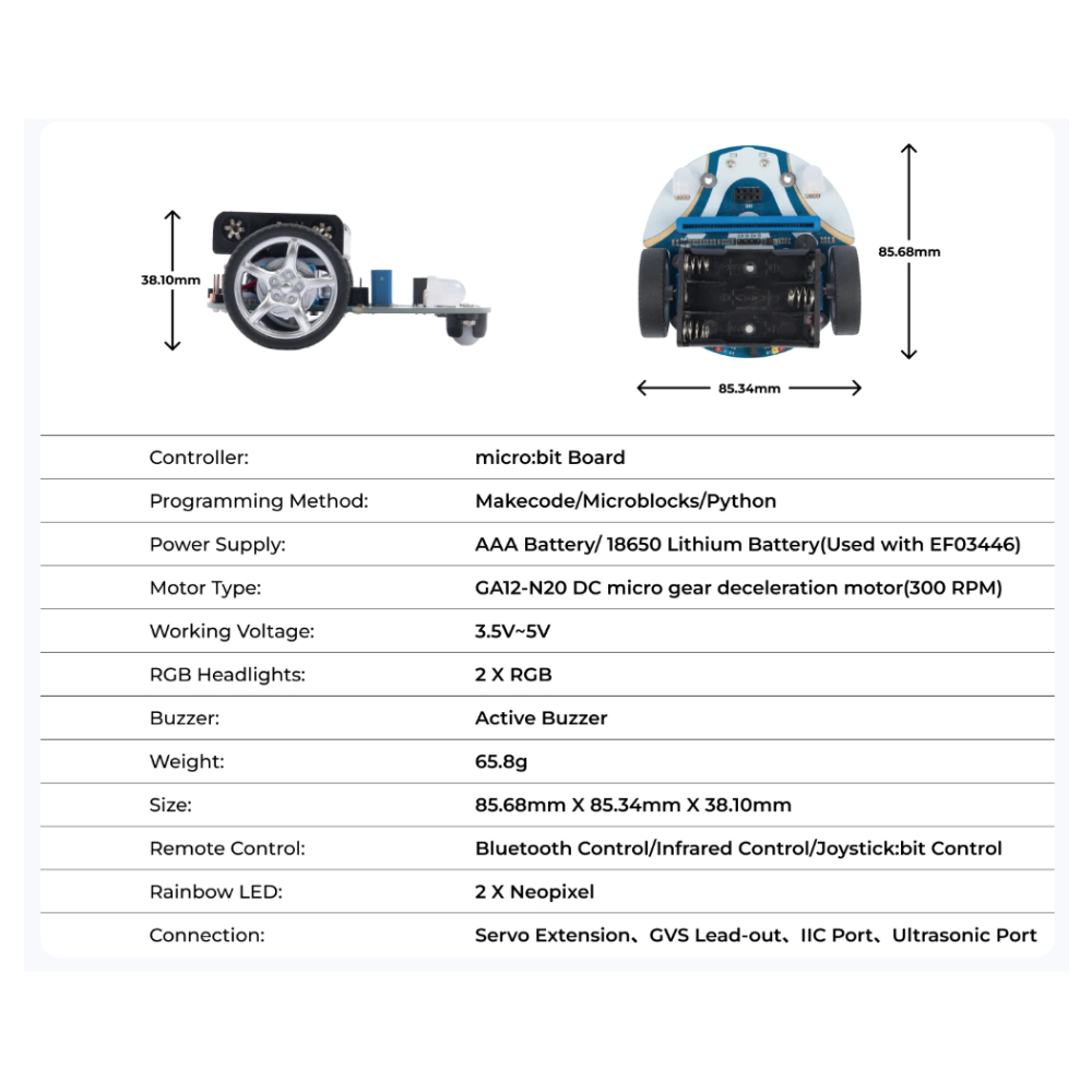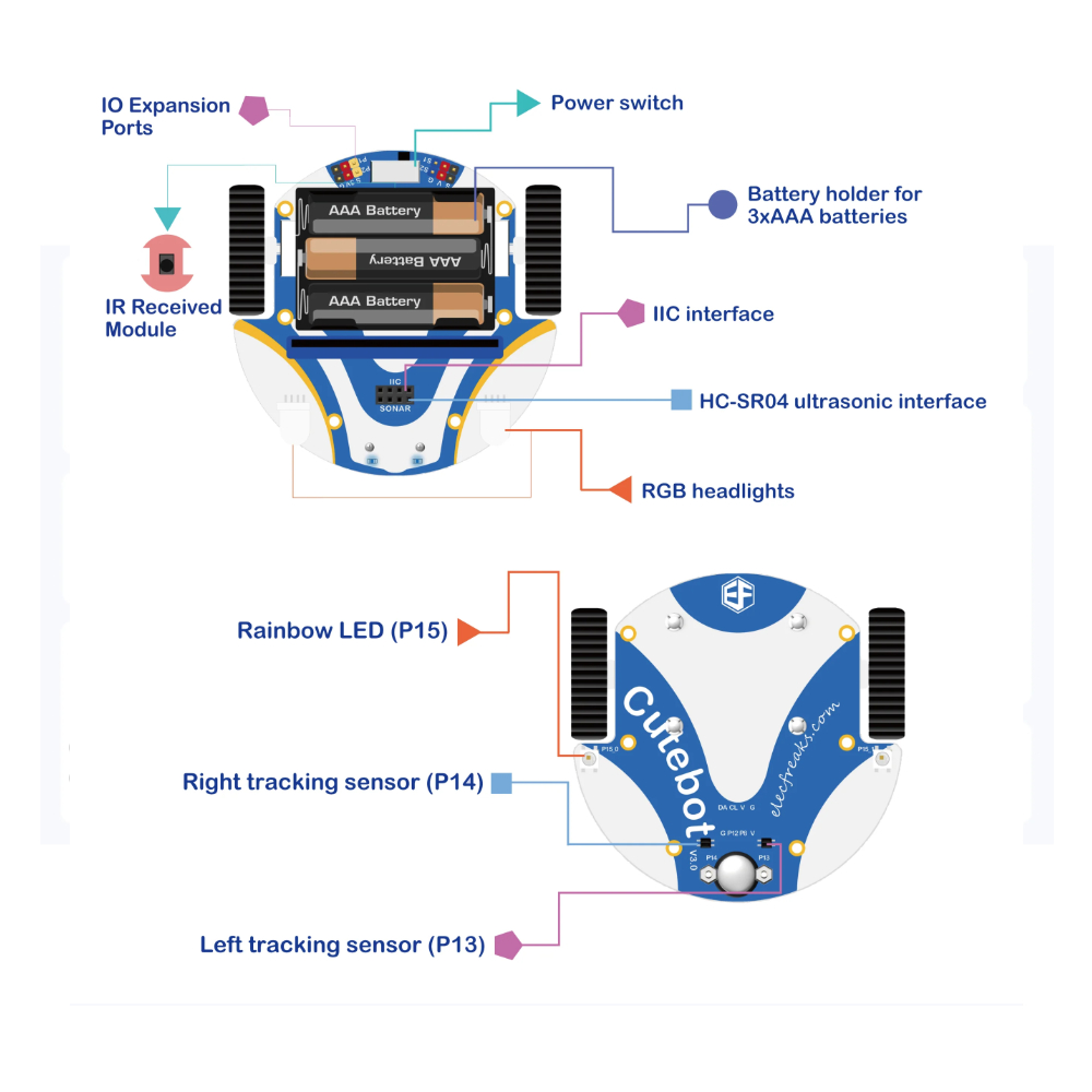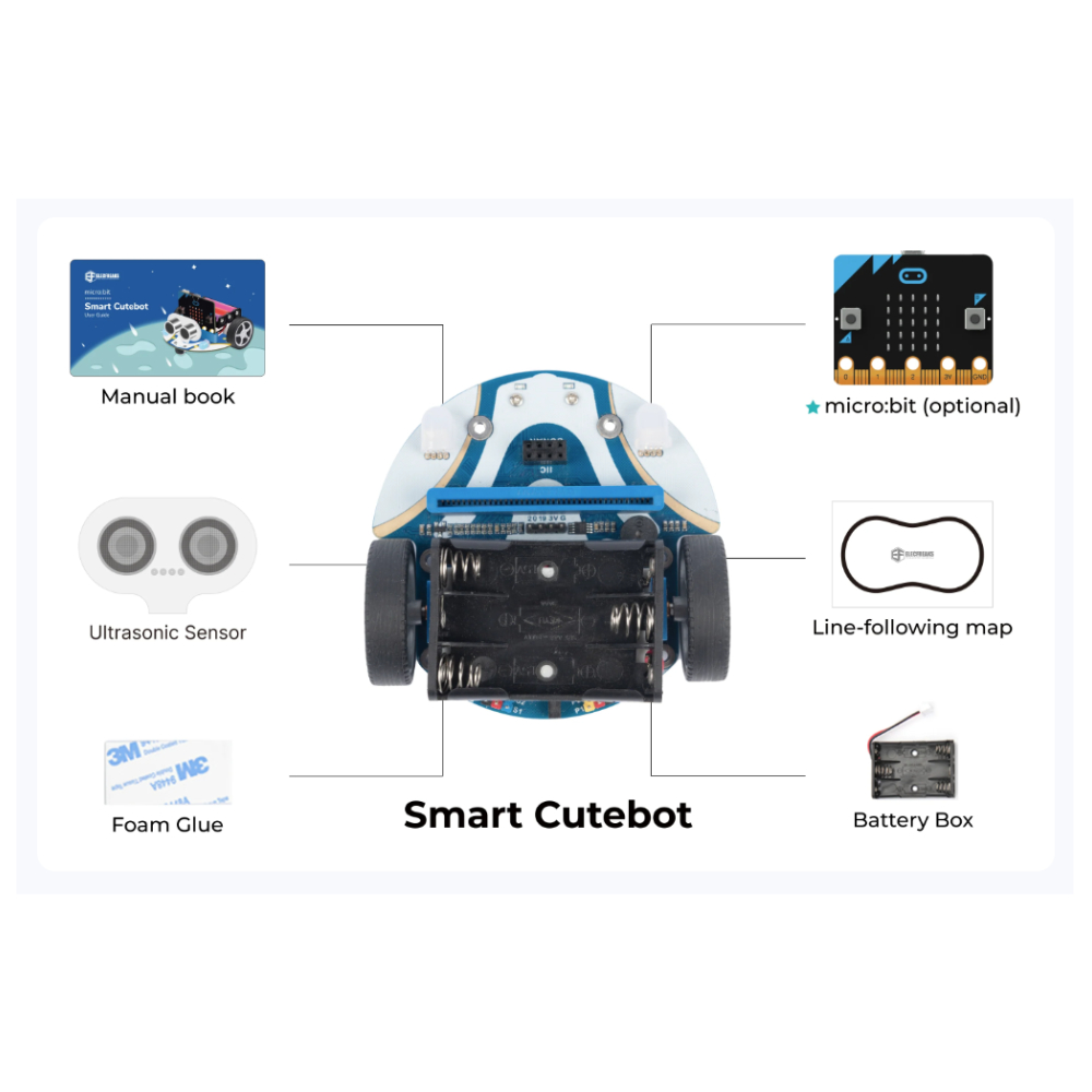 The ElecFreaks Cutebot is a rear-wheel drive smart car designed for the micro:bit, featuring two powerful motors for fast and responsive movement. Packed with built-in features, it includes an ultrasonic distance sensor, dual RGB headlights, underglow position lights, two line-following sensors, and a buzzer that functions as a horn.