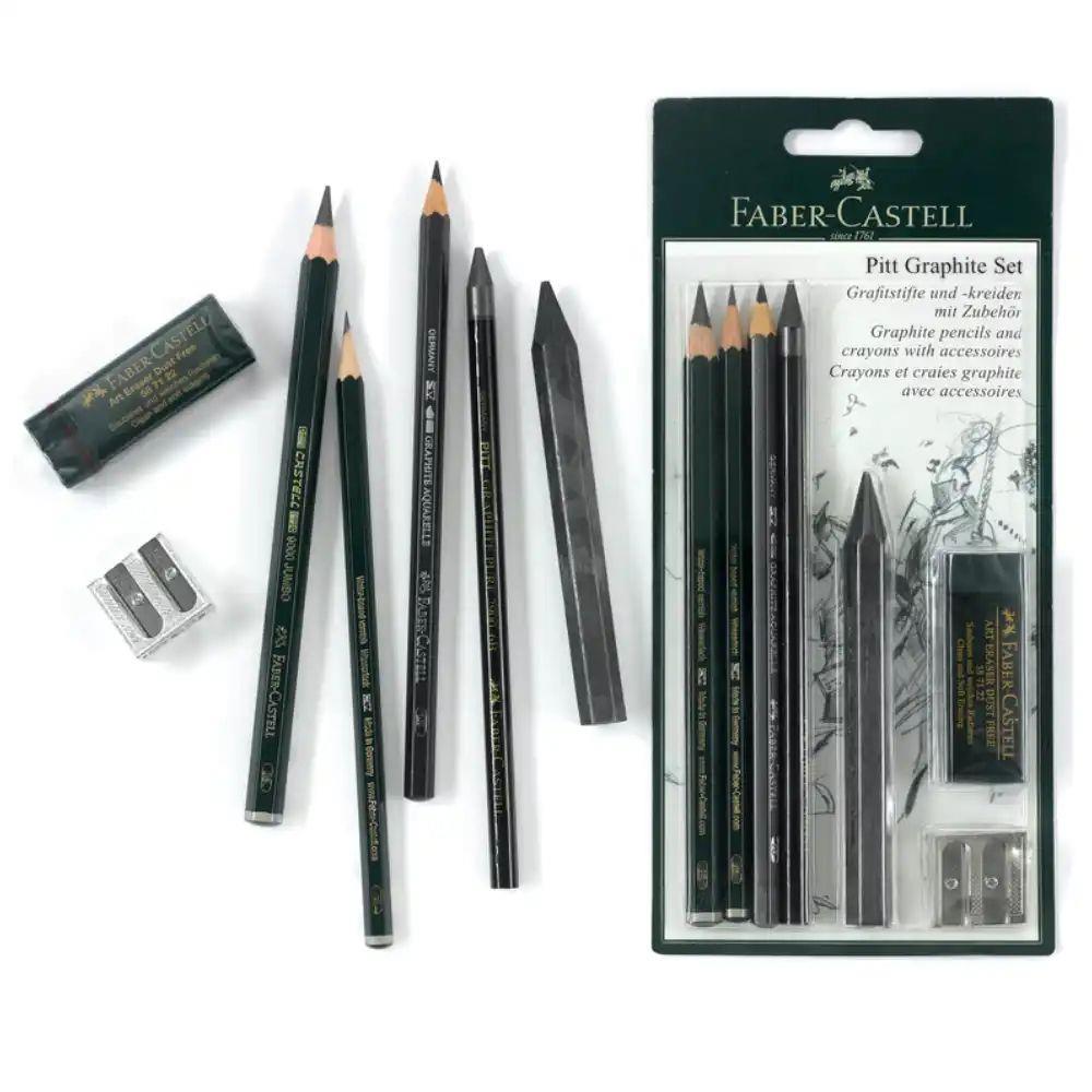 Faber Castell Pitt Graphite Set. Faber-Castell's Pitt Graphic range provides all creative artists with an extensive range of pencils and crayons in different grades of hardness for sketching graphic design and shading work. The PITT Graphite Pure leads are ideal for creating contrasts and shading extended areas.