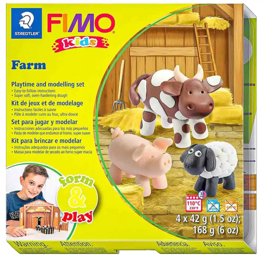 Fimo Kids Farm Set. Containing 4 blocks of 42g modelling stick, step-by-step instructions & background scene.