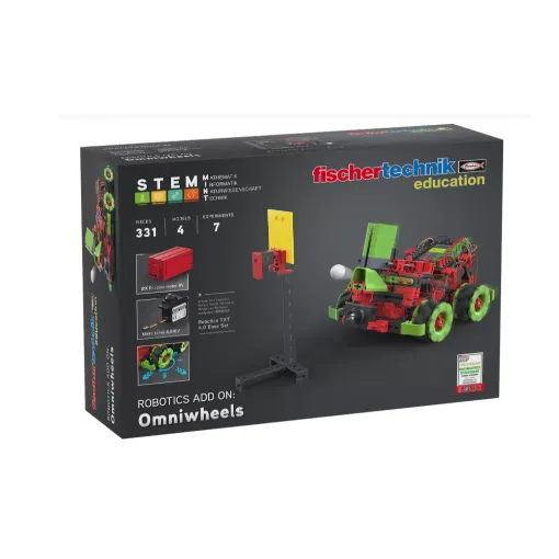 Program your own robots using the fischertechnik Robotics Add On: Omniwheels. Alongside the Robotics Base Set, students can build four exciting omniwheel models just waiting to come to life. Builders can create driving robots to complete different tasks, like a football robot, a shooting robot that detects and shoots at a target, and a painting robot with a pencil it can raise and lower. One highlight of this building set are the omniwheels, which are operated by four encoder motors (two of which are included in the Base Set) and allow the robot to move in any direction. The camera included in the Base Set delivers image processing that allows the football robot, for instance, to detect a ball and shoot it at full force! The new fischertechnik TXT 4.0 Controller works with new ROBO Pro Coding programming software to offer a variety of new features. In addition to graphic programming in the Blockly library, it now also allows for programming using Python. The software is not dependent on any specific operating system, and can be used on mobile devices. The set also contains a servo motor.