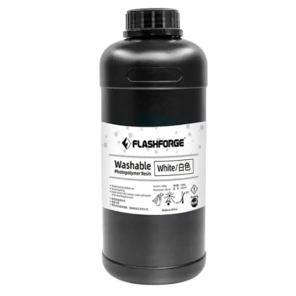 Flashforge Washable Photopolymer Resin 1ltr - White is a type of 3D printing resin that is designed for use with various 3D printers. This high-quality resin is formulated to produce smooth and detailed prints with exceptional accuracy and a bright white color.