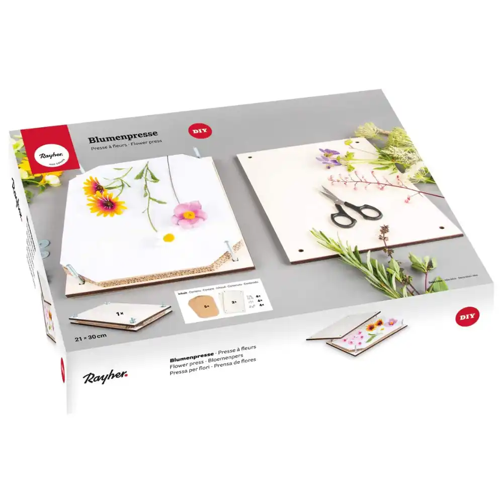 Flower press, 21 x 30 cm, poplar plywood, FSC-certified, 2 plates 8 mm thick. The wood is stable, untreated and finely sanded.Including 5 corrugated cardboard blanks and 4 butterfly screws.