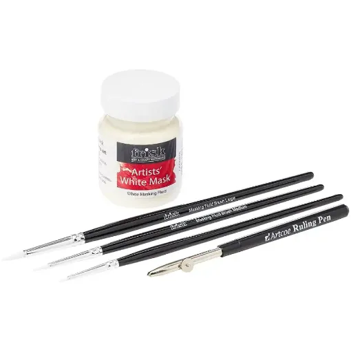 This set of Artcoe White Mask, Artcoe Masking Fluid Brushes and the Artcoe Ruling Pen will help improve your use of masking fluid no end! It is ideal to cover up areas you want to leave blank or come back to, and can be rubbed or peeled off using a putty eraser or your fingertips.