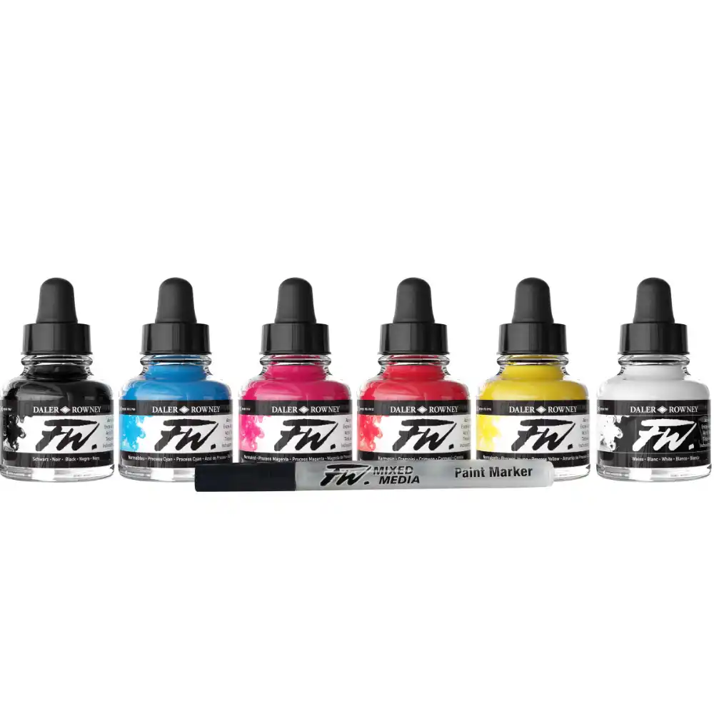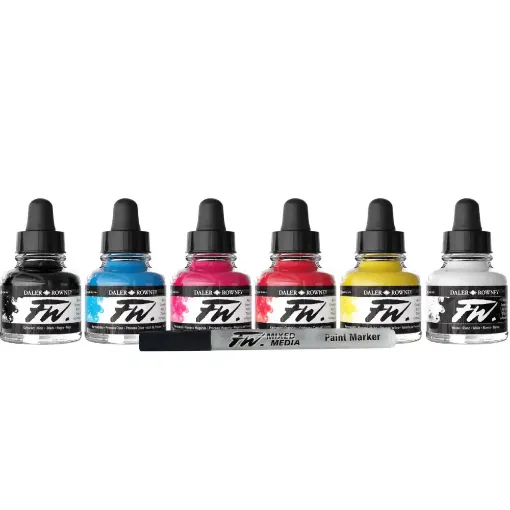 Daler-Rowney FW Ink Primary Colours Set, featuring six 29.5ml bottles of vibrant, acrylic-based ink in essential primary hues. These rich, primary colors can be applied with acrylic brushes or technical pens, and their intensity can be adjusted by dilution for achieving lighter tones and washes.