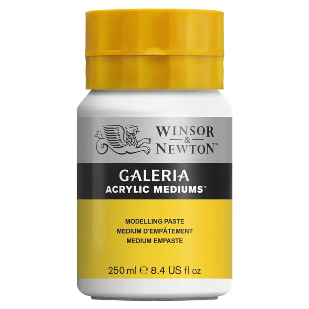Winsor & Newton Galeria Modelling Paste is a lighter-weight modeling paste for use on canvas (to minimise sagging). finely textured with a soft sculptural consistency. Suitable for building multiple layers. Matt finish. May be over-painted. Colour may be added directly to modeling pastes (note that colour will become lighter and more 'chalky' and the resulting paste will have reduced body).
