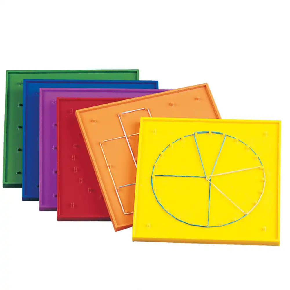 Sturdy plastic, transparent geoboard is perfect for use on an overhead projector. Features a 23cm 11x11 pin grid with raised edges to protect knobbed pegs. Elastic bands included.