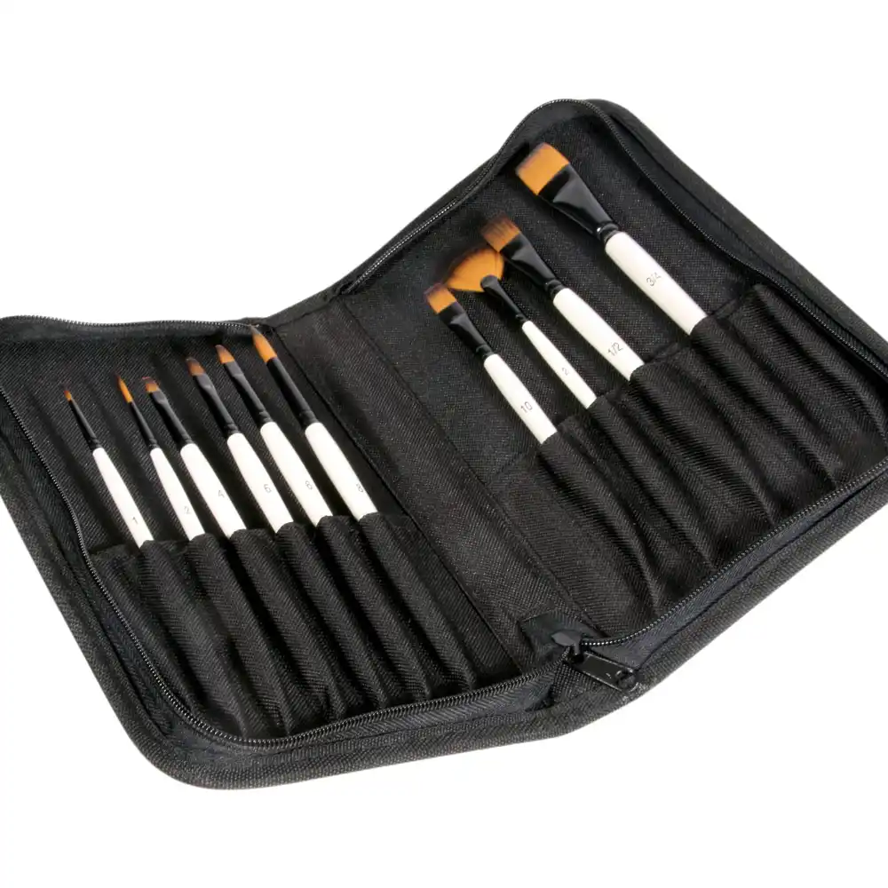 This Graduate Brush Set provides a selection of 10 short handled acrylic and oil paint brushes, and comes in a hard-wearing black zip case.