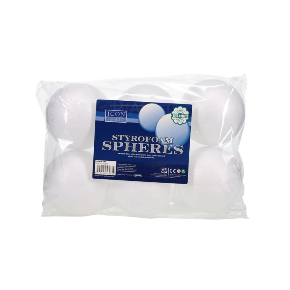 This pack includes six 90mm lightweight foam balls, perfect for a wide range of crafting and DIY projects. Easy to paint, cut, or decorate, these spheres are ideal for creating custom ornaments, school projects, or even festive decorations. Their smooth surface makes them a versatile choice for use with a variety of materials like glue, markers, or fabric. Whether you're working on a hobby project or need supplies for classroom activities, these durable foam spheres offer endless creative possibilities.
