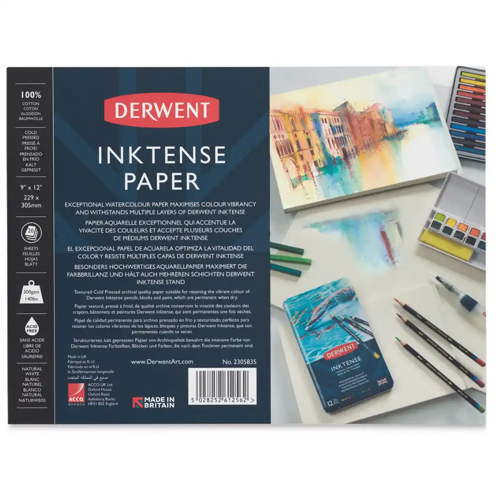 Derwent Inktense Paper is Natural White, acid-free, 140 lb (300 gsm) paper with a textured cold press finish. Made from 100% cotton, it is ideal for Inktense layering techniques and maximizes the vibrancy of Inktense pencils, blocks, and paints. Traditionally made on a cylinder mould machine, this professional-quality paper is surface sized to provide strength and resistance to moisture, feathering, and bleed through.