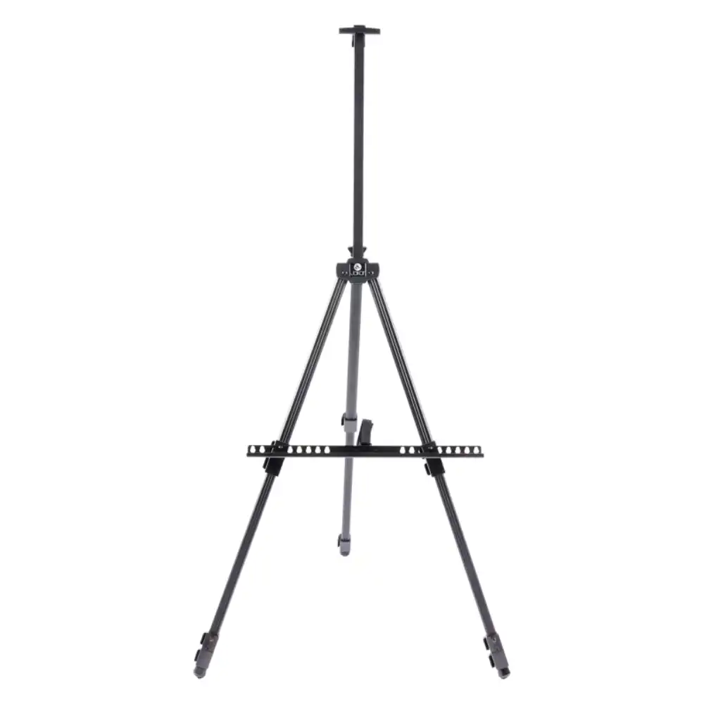 This compact and portable lightweight black Field Easel is packed in a convenient carry bag with handle to make outdoor location painting as easy and enjoyable as possible. Telescopic legs for height adjustment and stability. Adjustable shelf for variable canvas sizes. Rubber feet for added stability on uneven surfaces. Fully retracted it can also be used as a desktop easel. For canvases up to 130cm in height. Use indoors, outdoors or as a desktop easel.