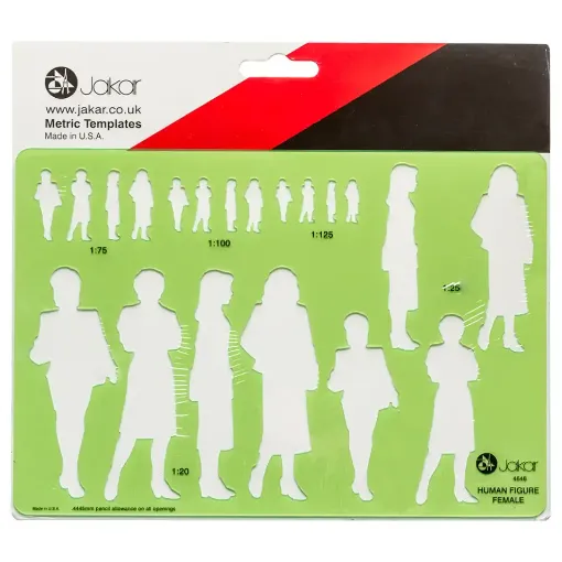 This Jakar Female Human Figure Template features five different scales, 1:20, 1:25, 1:75, 1:100 and 1:1.25 that enables you to accurately draw female figures in a range of four different postures.
