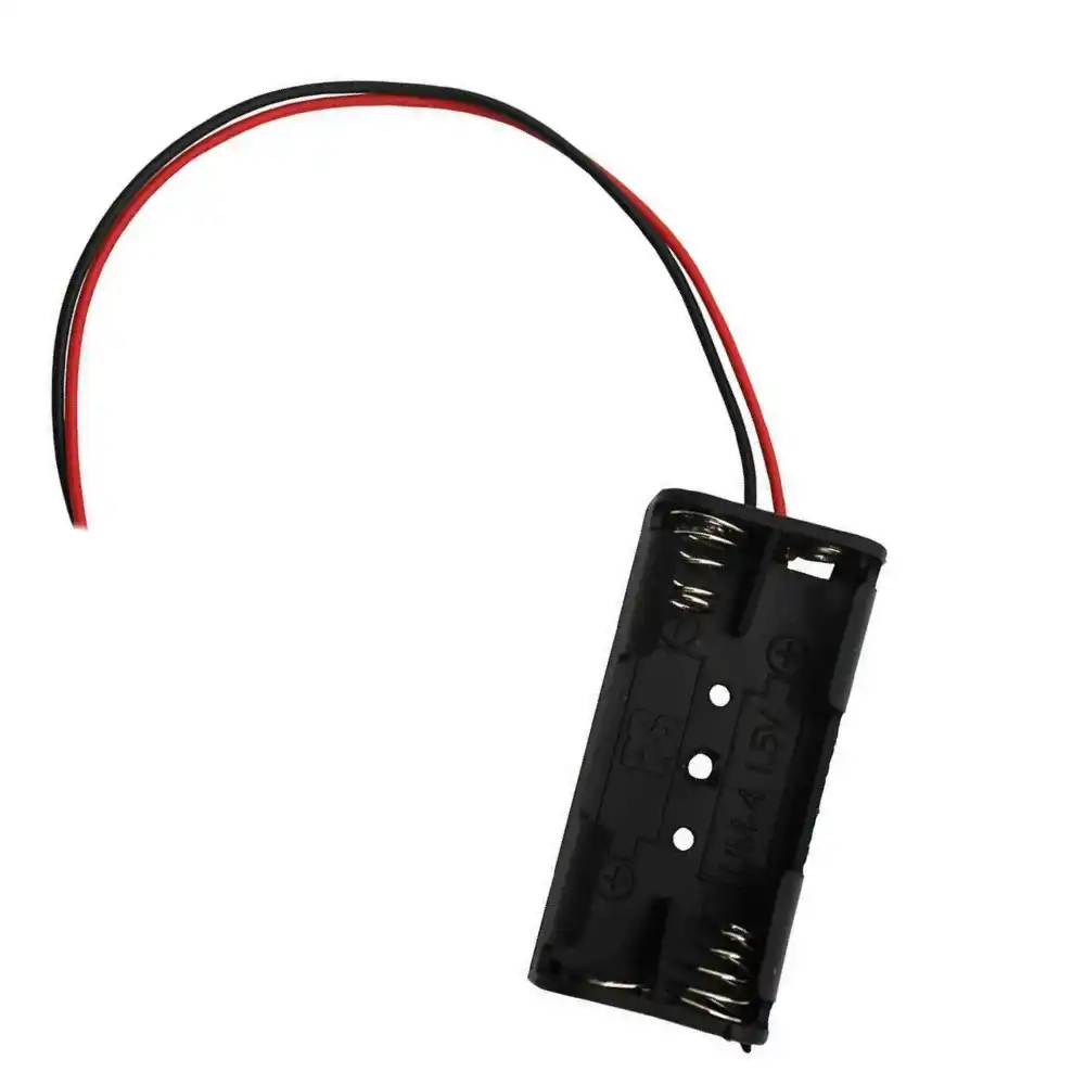 4xAA Covered Battery Holder with built-in on/off power switch and leads. Supplied with 150mm colour coded flying leads. Features a sliding cover for easy access to battery compartment. Case is hard plastic and is resistant to sudden impacts and vibrations. Ideal in any project kit requiring AA battery power.