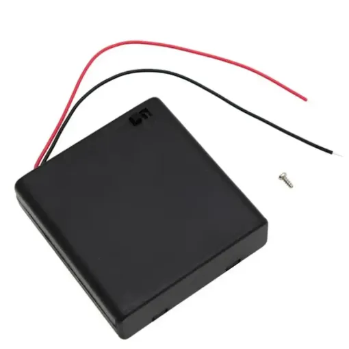 4xAA Covered Battery Holder with built-in on/off power switch and leads. Supplied with 150mm colour coded flying leads. Features a sliding cover for easy access to battery compartment. Case is hard plastic and is resistant to sudden impacts and vibrations. Ideal in any project kit requiring AA battery power.