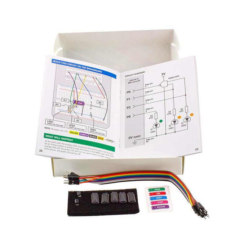 Included in this kit are 5 IC's, each a different type of logic gate. They are; AND, OR, XOR, NAND, and a NOT Gate. There are also colour coded stickers included, and these colours are used throughout the booklet in the circuit diagrams. The kit also contains 2 x 2N7000 FETs and a pack of 10 male to male jumper wires. Each experiment also makes use of components from our Inventor's kit for micro:bit, often LEDs as they offer a visual and immediate indication of the 'state' of gate inputs and outputs.