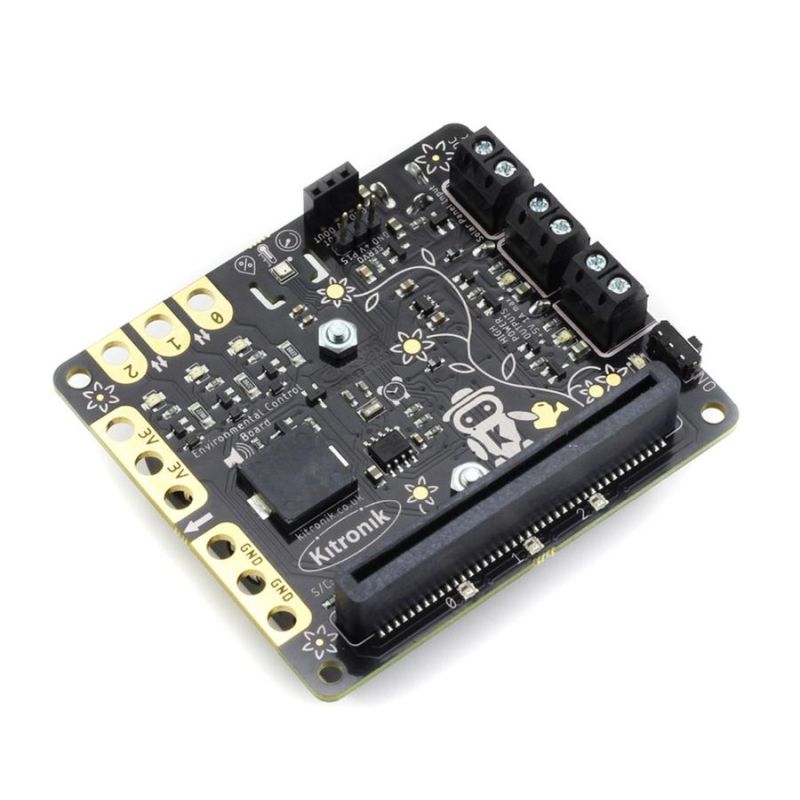 The Kitronik environmental control board provides a variety of sensor inputs and connection points for the BBC micro:bit (V1 & V2) and provides the ability to control outputs for devices such as a water pump, fan, servo or heater pad. This makes it ideal for feedback control systems. This board is also supplied as part of the Kitronik Smart Greenhouse Kit.
