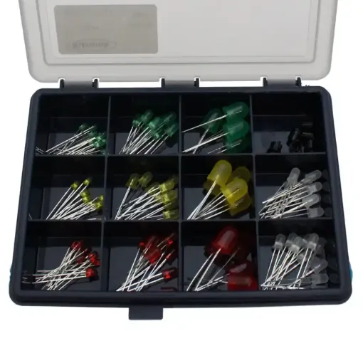 The LED kit contains red, green & yellow LEDs in 3mm, 5mm and 10mm round sizes as well as some Colour Changing and Tri colour LEDs plus some 5mm LED panel mounting holders. 105 parts are supplied in a multiple compartment storage box.