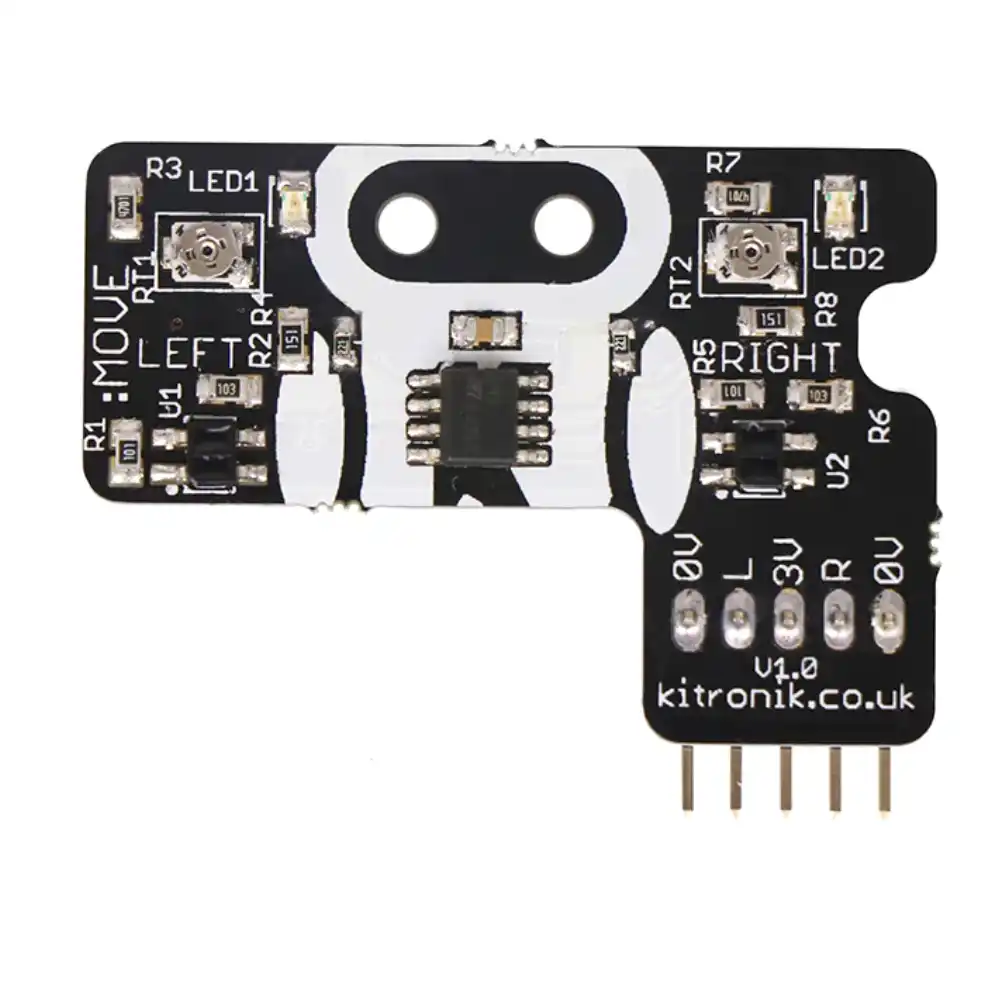 Add line following to your BBC microbit Robot/buggy projects with the :Move Line Following Board for BBC micro:bit. Although designed with the :MOVE mini in mind, this board can be used to add line following to any micro:bit buggy. If adding line following to the :MOVE mini, you will need the Line Following add-on for :MOVE mini instead. This is because the fixings for the :MOVE mini are not included in this kit.