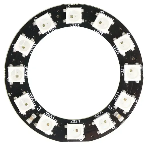 The 5 full-colour RGB LEDs are mounted on the boards centre line and are driven by a small onboard chip which is pre-programmed to deliver 4 patterns, selected by pressing the button to step through them: