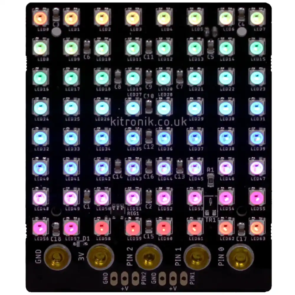 The Kitronik ZIP Tile is an 8 x 8 display panel for the BBC micro:bit. It can scroll text, show all the colours of the rainbow (and more) and multiple Tiles can be linked up to make even bigger displays! It features 64 colour addressable LEDs arranged in an 8 x 8 grid, ZIP LED expansion points on the left, right and top of the board, and the ability to connect a BBC micro:bit with both bolts and croc clips. It also breaks out P1 & P2 to standard 0.1” (2.54mm) footprints. Each of these pins also have the required supply voltage and GND pads.