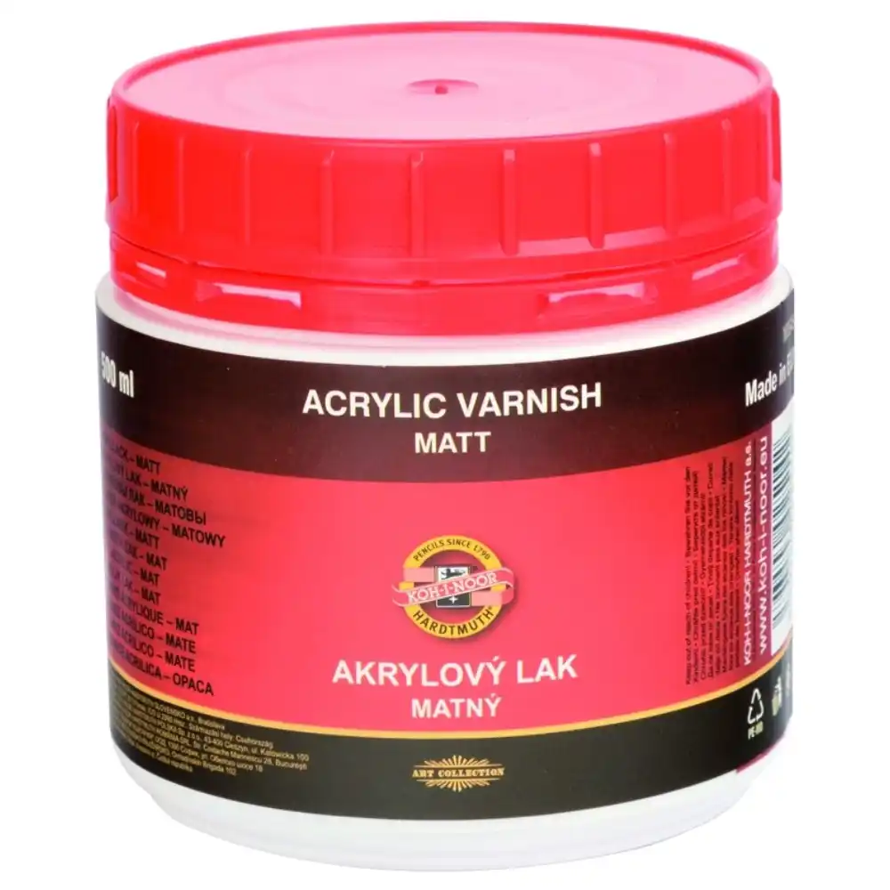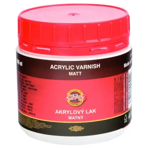 Koh-I-Noor Gloss Varnish 500ml. An acrylic water dispersion-based varnish. Dried coating is glossy, water-resistant, non-sticking on the surface, does not turn yellow. Applied by brush.