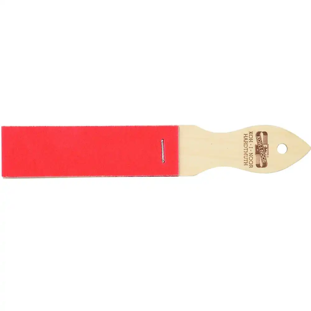 A block of sandpaper sheets fastened to a wooden handle for sharpening and pointing pastels and pencils.