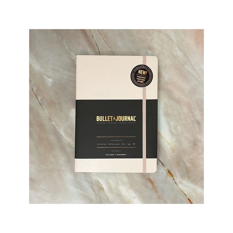 Leuchtturm 1917 Bullet Journal Edition 2 - Blush In order to better organize his own life, New York designer Ryder Carroll initially developed a method that would easily adapt to his personal needs. A ground-breaking idea, which can be easily applied and has therefore been adopted by people around the world. Generated in an intensive exchange with the international BuJo community, LEUCHTTURM1917 has designed new features and extras that make self-organisation even more individual and creative. The result of this cooperation is the new Bullet Journal;– Edition 2. Our details: • 120 g/sqm paper • Page divider for quick grouping of pages • Detachable Bullet Journal; pocket guide in English • Grid guide in the inside cover • Set of stickers featuring days of the week, months and much more ... • Ruling: Dotted • Three page markers • Index, Future Log and 206 numbered pages • Elastic enclosure band • Gusseted pocket for small souvenirs, notepads or cards • Thread-bound book • Stickers for labelling and archiving • Cover colour: Black or Blush with blind embossing "Bullet Journal" Format: Medium (A5) 145 x 210 mm Hardcover