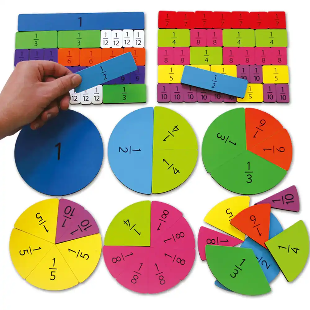 Fractions are represented in two different ways in this excellent magnetic set. The circular pieces show how fractions can describe part of a group while the rectangular pieces show how fractions can describe part of a length.