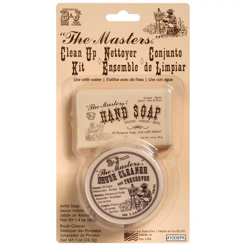 Complete cleaning kit for both artist and tools. Contains 1 x 40g (1.4 oz) spearmint-scented hand soap bar and 1 x 28g (1 oz) lemon-scented brush cleaner jar. Removes oils, acrylics, watercolours, stains, and varnishes.
