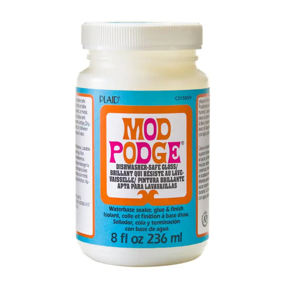 Mod Podge Dishwasher Safe Gloss, 16oz, is a water-based sealer, glue, and finish that allows you to create dishwasher-safe, long-lasting projects with a glossy finish.
