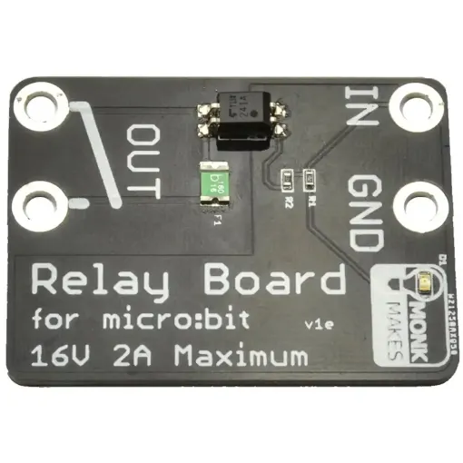 The MonkMakes Relay for the BBC microbit is a solid-state (no moving parts) relay that allows an output of a micro:bit to turn things on and off.