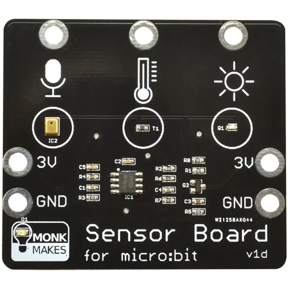 The MonkMakes Sensor Board allows you to detect sound levels, temperature and light levels. It features ring pad connectors for use with crocodile clips make it easy to connect to the board to a microbit.