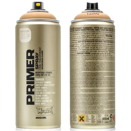 Montana Universal Primer spray enables excellent adhesion and further coating of synthetic, nitro-combi or acrylic spray paints. Montana offers different primers for application on different surfaces that need to be pre-treated such as plastic, metal and styrofoam. The Universal Primer also works on leather, cardboards, wood and many other materials. After the Primers have been applied you can work with Montana spray paint on pre-treated ground. Use primers for efficient and more permanent results. Easy to apply, to sand and re-coat. For indoor and outdoor applications (wearing respirator mask is recommended).