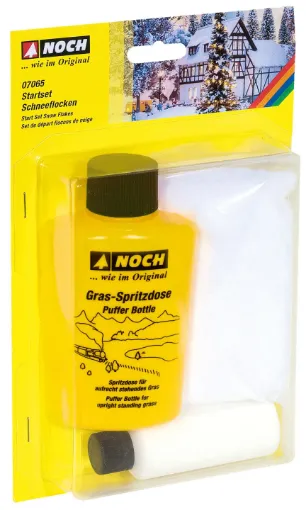 Create stunning winter scenes with the Noch Snowflake Starter Set, perfect for creative crafts, decoration, and DIY projects. This comprehensive set includes 25 g of 1 mm long, white snowflake fibers, 50 g of snow glue, and a spray can for easy application. Simply fill the spray can with the snowflakes, shake to electrostatically charge the fibers, and blow the fluffy flakes onto the glue-covered surface. The result is a velvety-soft blanket of snow that looks like it has just freshly fallen. Ideal for adding a realistic winter touch to any project. Instructions are provided on the back of the packaging.