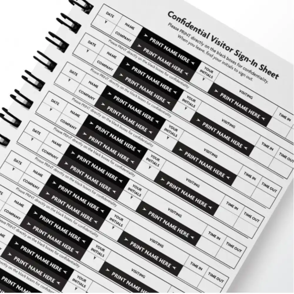 GDPR compliant - Ogham confidential visitors sign-in book. Securely record your visitors in and out movements without revealing any unnecessary details. All Signatures are recorded onto a sealed carbonless page for internal use only. 450 sign-in's per book.