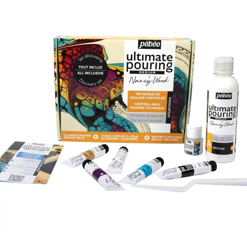 Everything you need to create multiple pouring artworks. A pre-Mixed Acrylic Pouring Set is a great one to try for your painting. The set comes with a ready-to-use pour-on formula and is easy to use. No mixing required. This Complete Pre-Mixed Pouring Set set from Reeves includes;