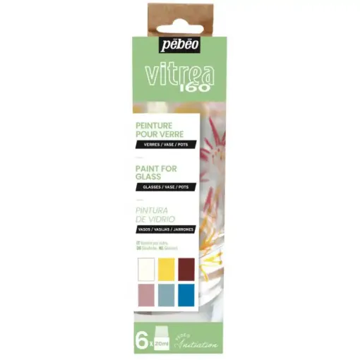 A set of 6 Pebeo Vitrea 160 colours for glass painting. Vitrea 160 provides dishwasher resistant colours for glass, after baking in a standard domestic oven at 160°C, for 40 minutes (to protect the glass surface, do not preheat).Once baked, colours become enhanced and become resistant to dishwashing and to normal solvents and detergents, making this the ideal paint for glass tableware and wine glasses.