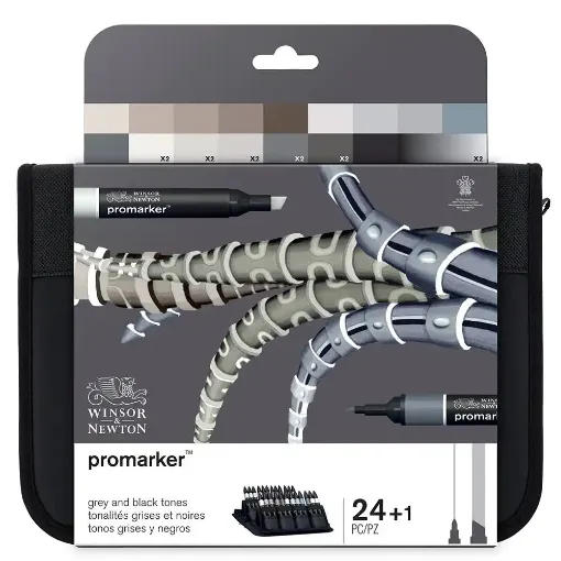 Winsor Newton Student Designer Promarker Wallet Set - Grey and Black Tones. Ideal for all kinds of artwork, illustration, sketching, fine art, interior design, landscape design, architecture, calligraphy, manga, cartoon drawing and more. Create tonal visuals and greyscale art, or add shade and definition when working in colour with this comprehensive collection.