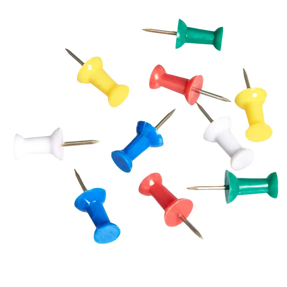 Ideal for notice boards in the office, reception or even in the home, these push pins in assorted colours are a light and practical way of putting up posters and reminders. Made from solid plastic in blue, red and green, each pin has ridged ends to make them easy to handle and a sharp pin that slides easily into cork boards and walls.
