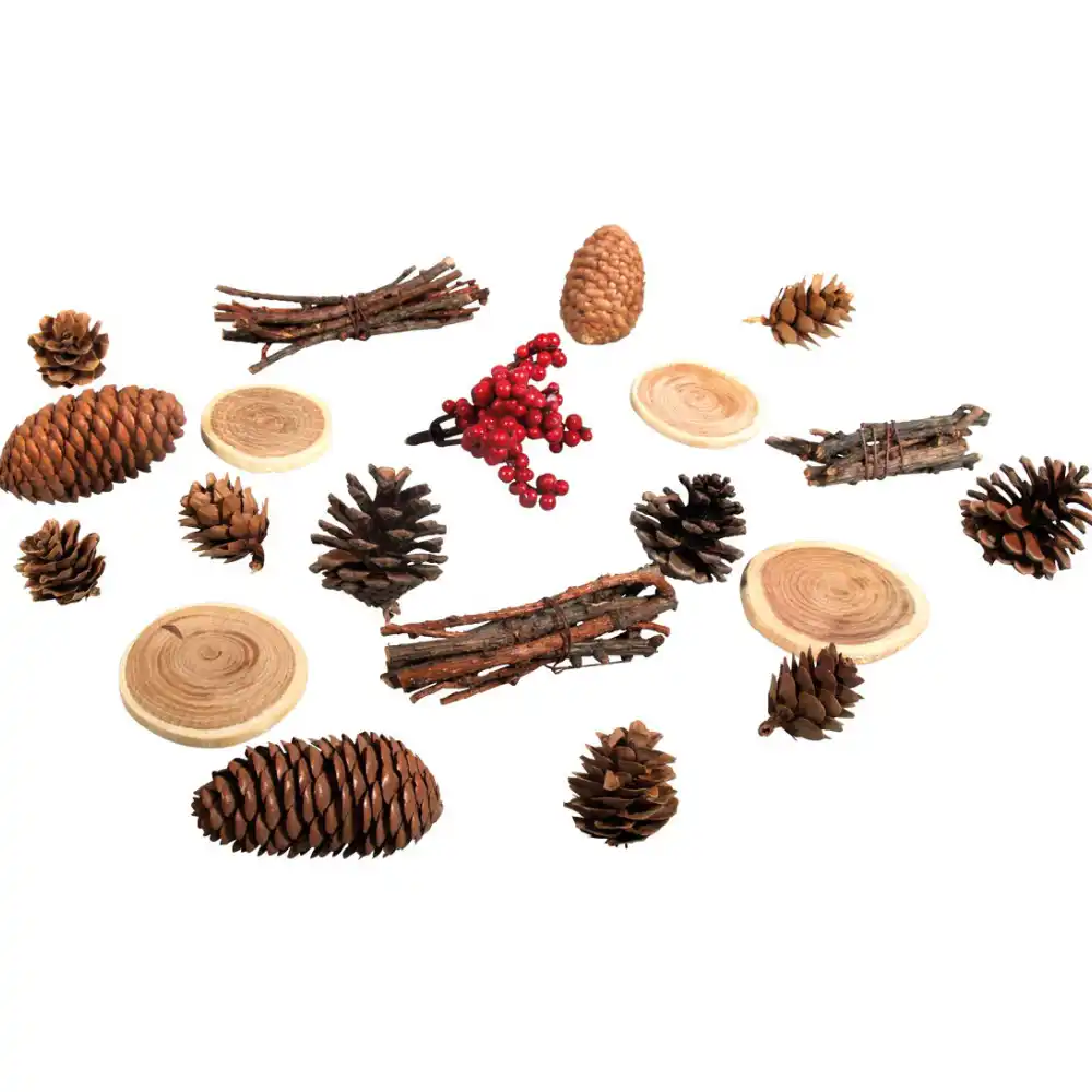 Inside, you'll discover a total of 20 pieces, featuring small cones approximately 3 cm in height, large cones ranging from 4.5 to 5.5 cm in height, branch slices with diameters of approximately 4 to 5 cm, twig bundles measuring around 9 cm in length, and a berry twig standing at approximately 6 cm in height. Please note that due to their natural origin, these products may exhibit slight variations in dimensions and appearance.