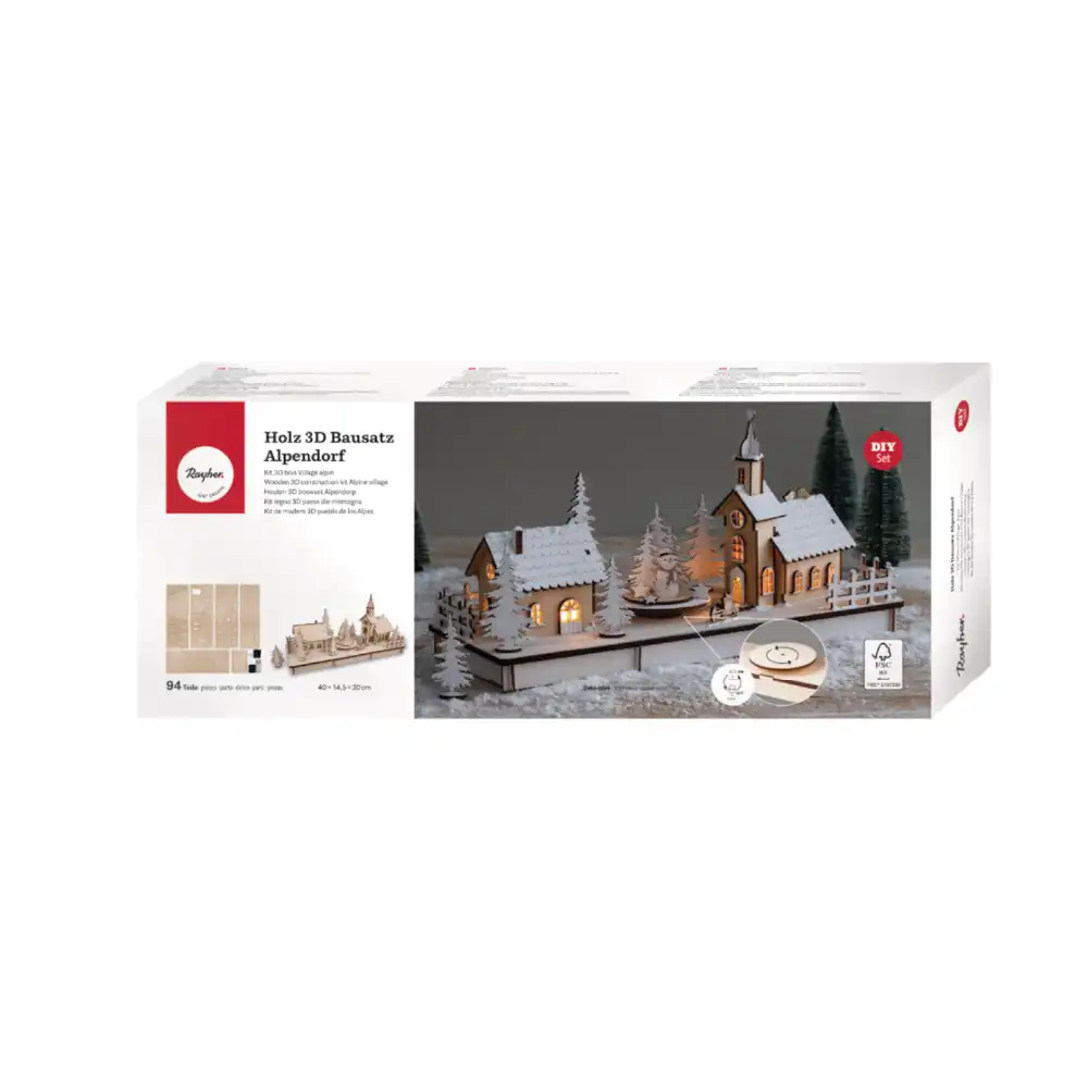 Create a charming winter scene with the Rayher Wooden 3D Kit Alpine Village. Perfect for DIY enthusiasts, this kit includes all the pieces you need to construct a beautiful Alpine village. Great for festive décor or as a unique craft project.