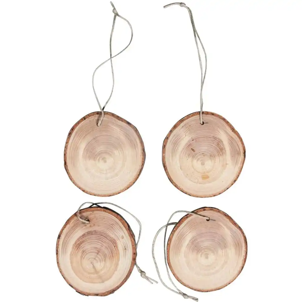 Contents of the pack: 6 wooden discs, 6 cm ø, thickness 3 mm, with a small hole for the hanger + 6 jute string hangers.