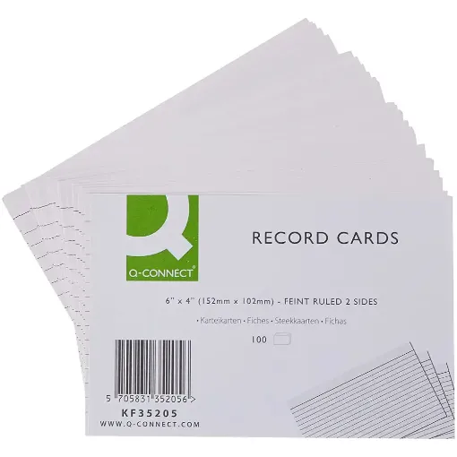 Q-Connect Record Cards can be used for revision, prompts, archiving, indexing and storyboarding. Measuring 6 x 4 inches, the cards are feint ruled on both sides, ideal for storing contact information and keeping neat and legible notes. This pack contains 100 record cards.