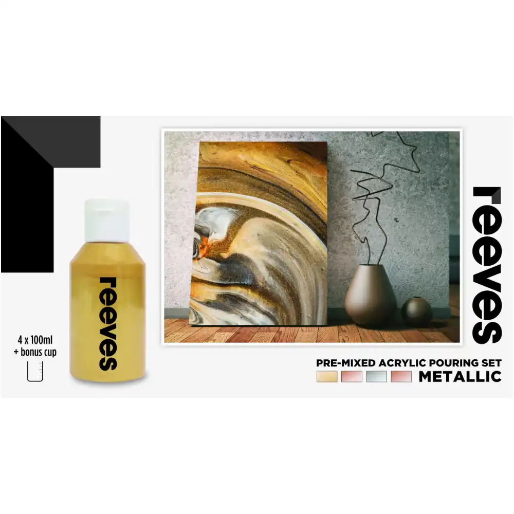 Everything you need to create multiple pouring artworks. A pre-Mixed Acrylic Pouring Set is a great one to try for your painting. The set comes with a ready-to-use pour-on formula and is easy to use. No mixing required. This Complete Pre-Mixed Pouring Set set from Reeves includes;