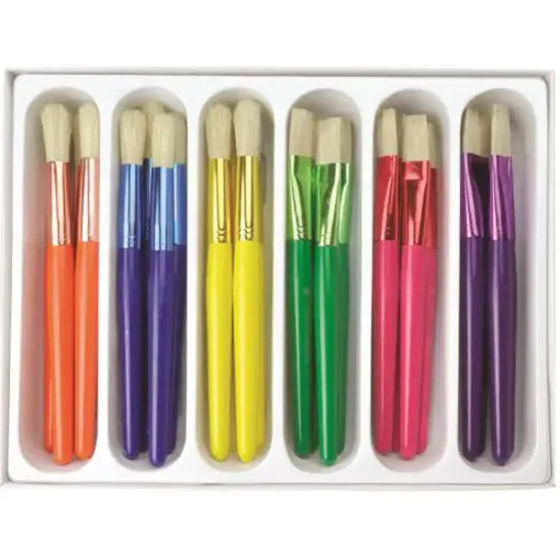 These brushes are ideal for young beginners and are also suitable for any paint. The handles are chubby and easy to grip . The ferrules are seamless and the hair is bristle. The set comes in an assortment of coloured brush handles and includes a tray to store them in.