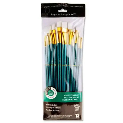 • 12 Firm White Taklon bristle brushes suitable for use with Acrylic & Oil paints.